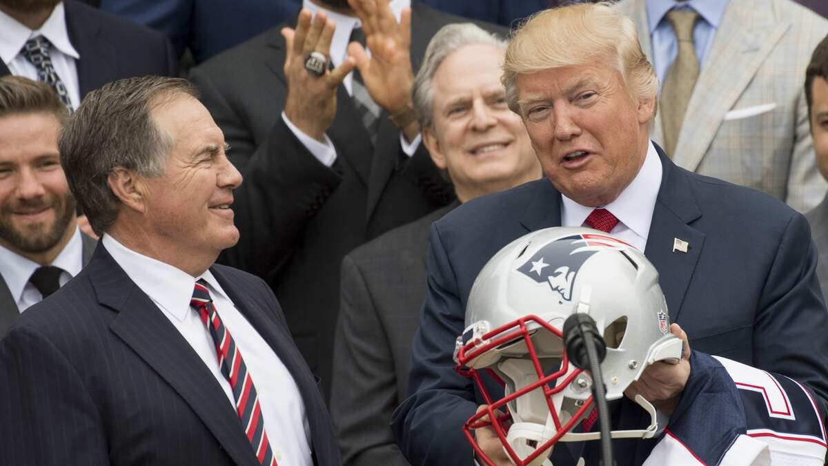 US President Donald Trump holds a football helmet given to him by New England Patriots head coach Bill Belichick (L) alongside members of the team during a ceremony honoring them as 2017 Super Bowl Champions on the South Lawn of the White House in Washington, DC, April 19, 2017. / AFP PHOTO / SAUL LOEB (Photo credit SAUL LOEB/AFP via Getty Images)