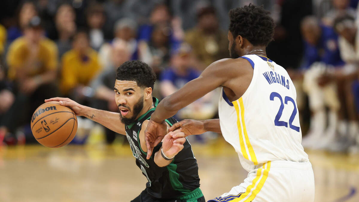 SAN FRANCISCO, CALIFORNIA - JUNE 13: Jayson Tatum #0 of the Boston Celtics fights for position against Andrew Wiggins #22 of the Golden State Warriors during the third quarter in Game Five of the 2022 NBA Finals at Chase Center on June 13, 2022 in San Francisco, California. (Photo by Ezra Shaw/Getty Images)