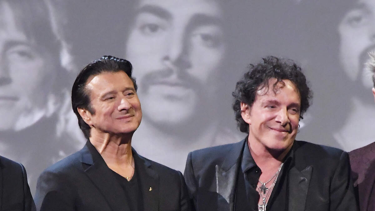 NEW YORK, NY - APRIL 07: 2017 Inductees Steve Perry (L) and Neal Schon of Journey speaks onstage at the 32nd Annual Rock & Roll Hall Of Fame Induction Ceremony at Barclays Center on April 7, 2017 in New York City. The event will broadcast on HBO Saturday, April 29, 2017 at 8:00 pm ET/PT (Photo by Mike Coppola/Getty Images)
