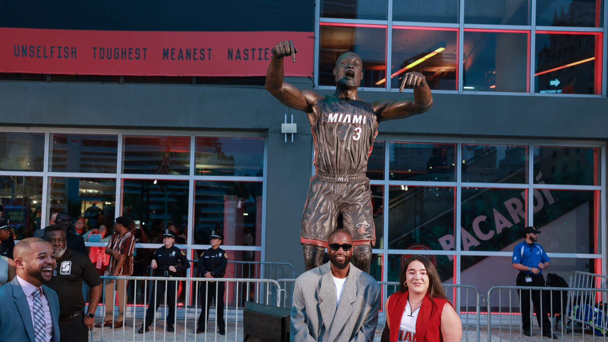 MIAMI, FLORIDA - OCTOBER 28: Dwyane Wade interacts with fans as they visit his statue that was unveiled on October 27th, prior to a game between the Miami Heat and the Detroit Pistons at Kaseya Center on October 28, 2024 in Miami, Florida. NOTE TO USER: User expressly acknowledges and agrees that, by downloading and or using this photograph, User is consenting to the terms and conditions of the Getty Images License Agreement. (Photo by Carmen Mandato/Getty Images)