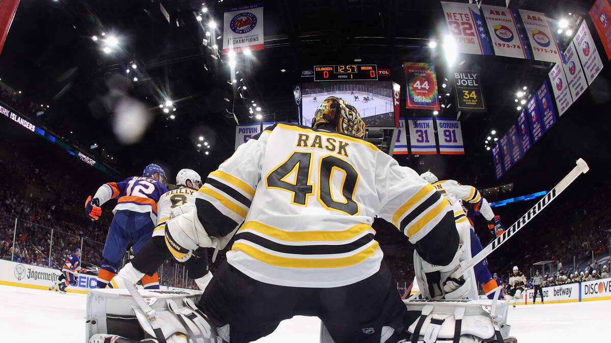 UNIONDALE, NEW YORK - JUNE 05: Tuukka Rask #40 of the Boston Bruins tends net against the New York Islanders in Game Four of the Second Round of the 2021 NHL Stanley Cup Playoffs at the Nassau Coliseum on June 05, 2021 in Uniondale, New York. The Islanders defeated the Bruins 4-1. (Photo by Bruce Bennett/Getty Images)Photo: Getty Images