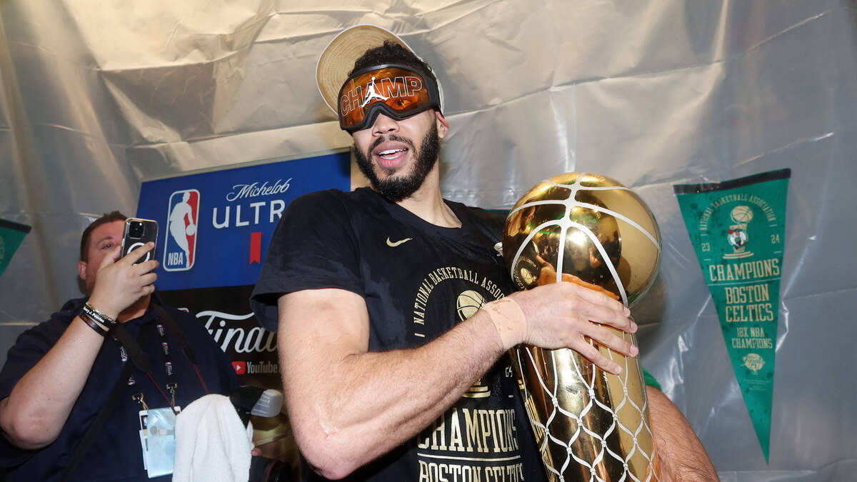 BOSTON, MASSACHUSETTS - JUNE 17: Jayson Tatum #0 of the Boston Celtics celebrates with the Larry O’Brien Championship Trophy in the locker room after Boston's 106-88 win against the Dallas Mavericks in Game Five of the 2024 NBA Finals at TD Garden on June 17, 2024 in Boston, Massachusetts. NOTE TO USER: User expressly acknowledges and agrees that, by downloading and or using this photograph, User is consenting to the terms and conditions of the Getty Images License Agreement. (Photo by Elsa/Getty Images)Photo: Elsa / Getty Images Sport / Getty Images