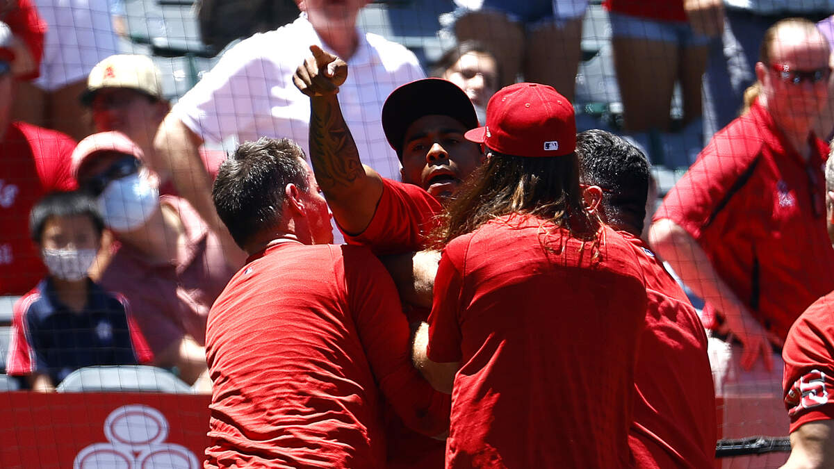 ANAHEIM, CALIFORNIA - JUNE 26: Raisel Iglesias #32 of the Los Angeles Angels is held back during a bench clearing after Jesse Winker #27 of the Seattle Mariners charged the Angels dugout after being hit by a pitch in the second inning at Angel Stadium of Anaheim on June 26, 2022 in Anaheim, California. (Photo by Ronald Martinez/Getty Images)Photo: Getty Images