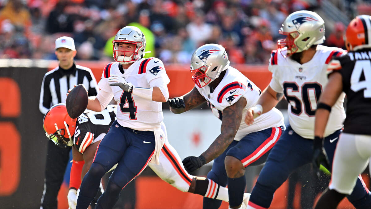 CLEVELAND, OHIO - OCTOBER 16: Bailey Zappe #4 of the New England Patriots attempts a pass during the fourth quarter against the Cleveland Browns at FirstEnergy Stadium on October 16, 2022 in Cleveland, Ohio. (Photo by Jason Miller/Getty Images)Photo: Getty Images