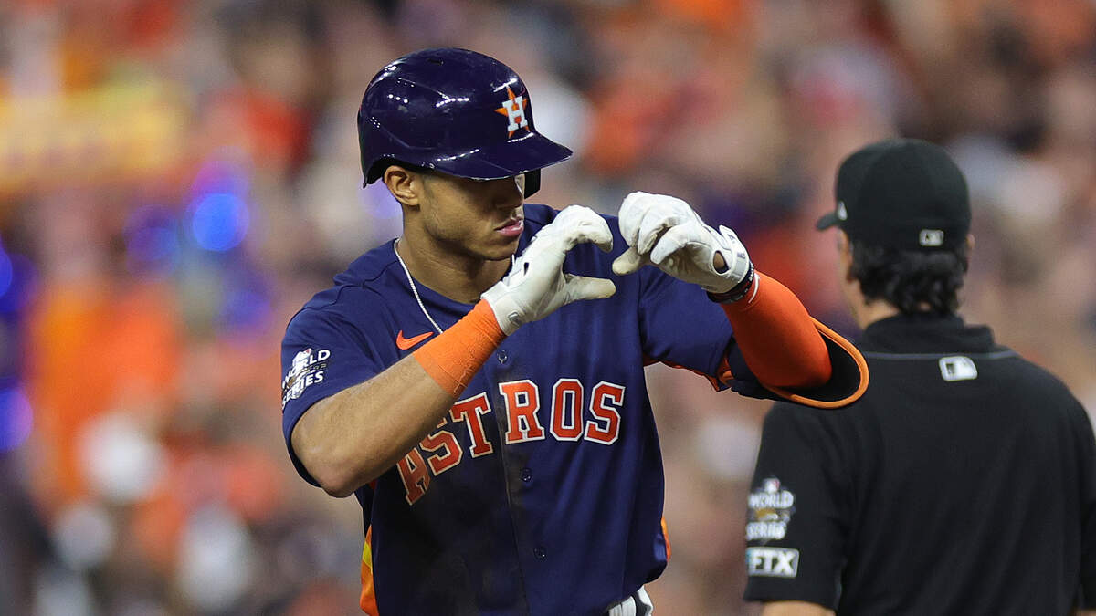 HOUSTON, TEXAS - NOVEMBER 05: Jeremy Pena #3 of the Houston Astros reacts after hitting a single against the Philadelphia Phillies during the sixth inning in Game Six of the 2022 World Series at Minute Maid Park on November 05, 2022 in Houston, Texas. (Photo by Carmen Mandato/Getty Images)Photo: Getty Images