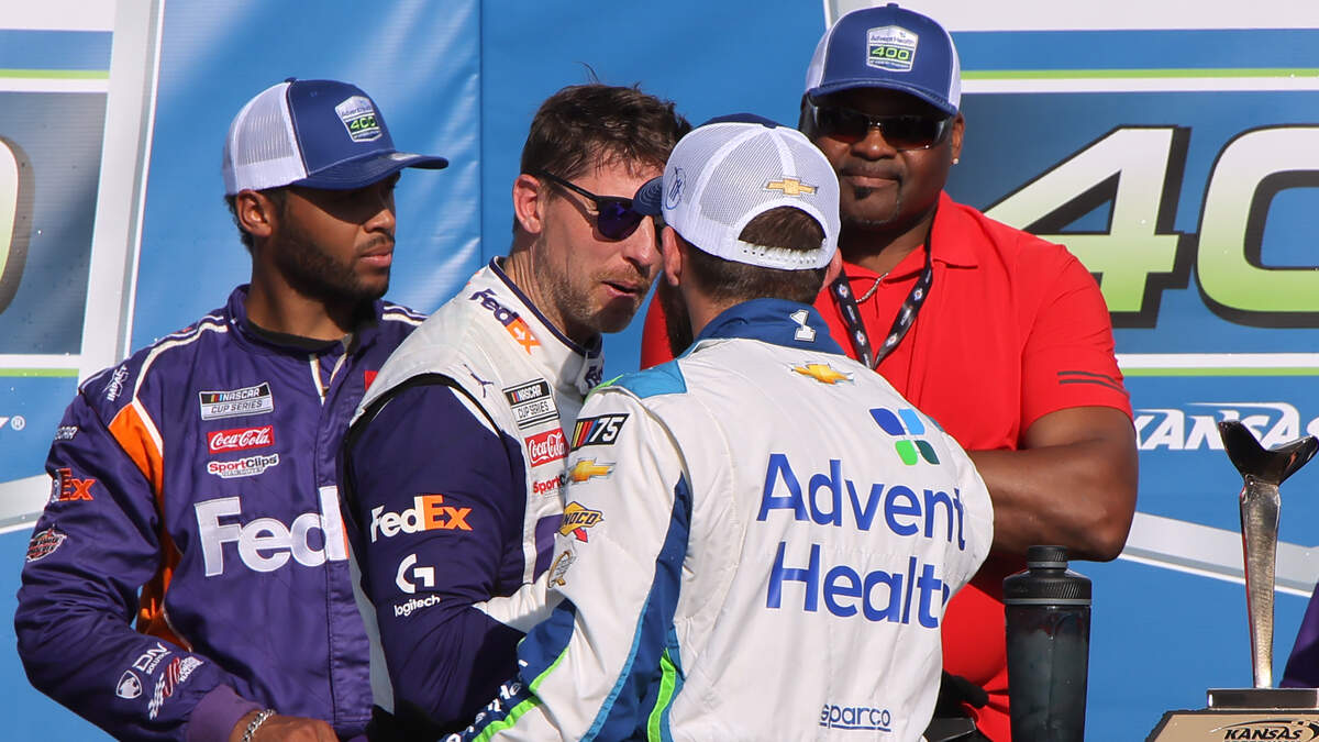 KANSAS CITY, KANSAS - MAY 07: Denny Hamlin, driver of the #11 FedEx Express Toyota, is congratulated by Ross Chastain, driver of the #1 AdventHealth Chevrolet, in victory lane after winning the NASCAR Cup Series Advent Health 400 at Kansas Speedway on May 07, 2023 in Kansas City, Kansas. (Photo by Jonathan Bachman/Getty Images)Photo: Getty Images