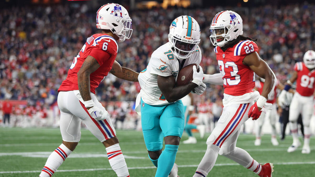FOXBOROUGH, MASSACHUSETTS - SEPTEMBER 17: Tyreek Hill #10 of the Miami Dolphins catches a pass for a touchdown against Christian Gonzalez #6 and Kyle Dugger #23 of the New England Patriots during the second quarter at Gillette Stadium on September 17, 2023 in Foxborough, Massachusetts. (Photo by Adam Glanzman/Getty Images)Photo: Adam Glanzman / Getty Images Sport / Getty Images