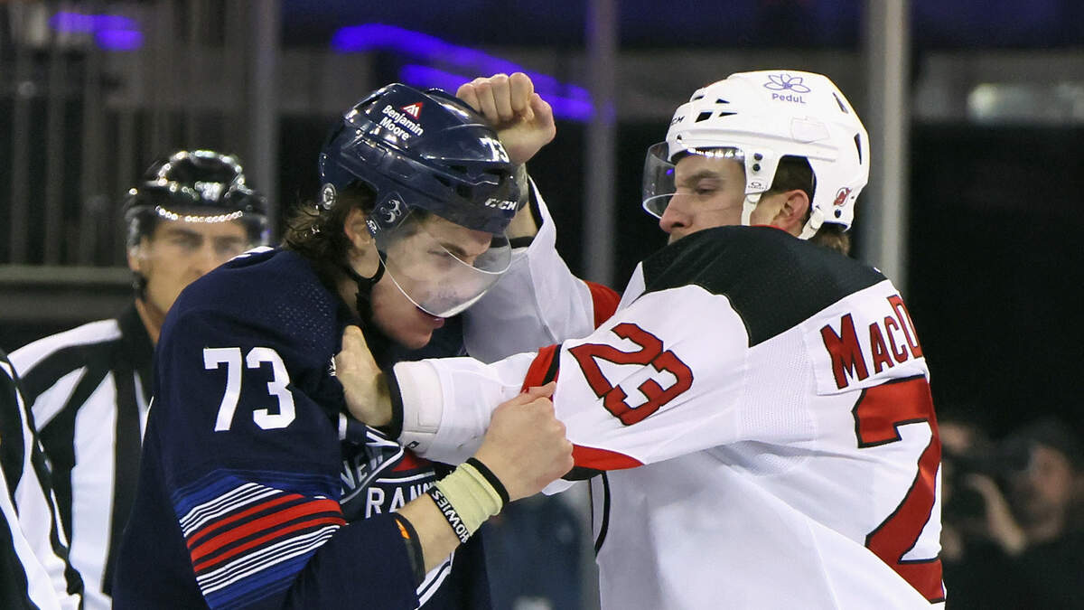 NEW YORK, NEW YORK - APRIL 03: Kurtis MacDermid #23 of the New Jersey Devils fights with Matt Rempe #73 of the New York Rangers during the first period at Madison Square Garden on April 03, 2024 in New York City. (Photo by Bruce Bennett/Getty Images)Photo: Bruce Bennett / Getty Images Sport / Getty Images